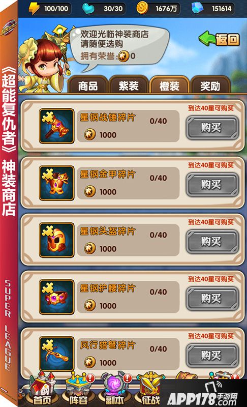 神装商店内出售蓝装、紫装、橙装碎片,荣誉则是在神装商店消费的唯一货币,达到评星要求可以以超高性价比在“奖励”标签页换购金币、装备成品、精炼石、钻石等道具,购买紫装碎片、橙装碎片也需要达成一定的评星要求。