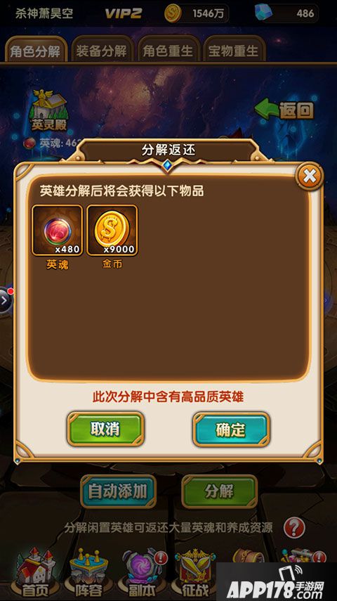 分解英雄可以获得金币和英魂奖励,英魂可在“英灵殿”中购买英雄碎片、培养剂、突破石等更多其他道具。