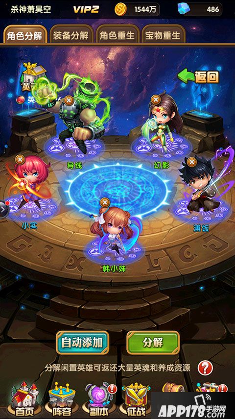 玩家可以点击屏幕中央的“+”手动选择想要分解的英雄,也可以点击下方“自动添加”按钮让系统自动添加,随后仍需点击分解按钮,避免玩家误操作。系统会优先选择品质低的英雄,最高会添加紫色品质的英雄进分解池,仍需使用紫色英雄的玩家在点击分解前需要注意。