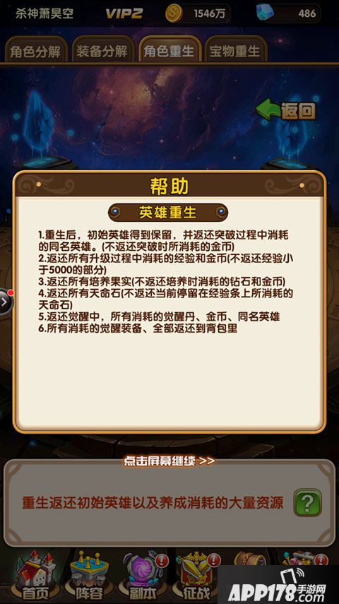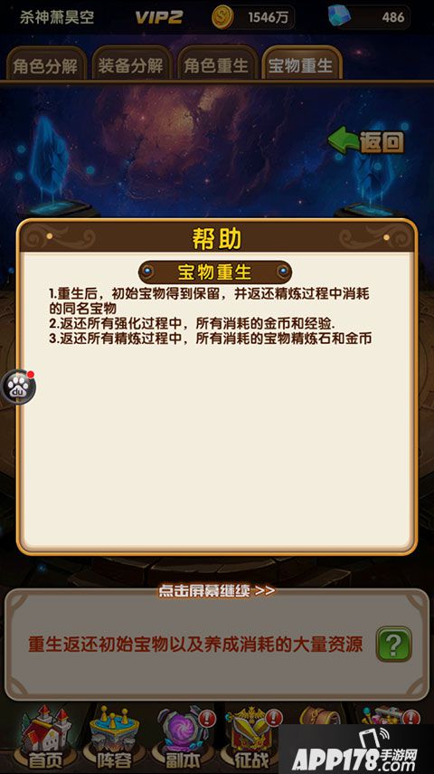 除此以外,针对强化后的英雄和宝物,还提供了重生功能。重生后会依据规则返还培养材料。