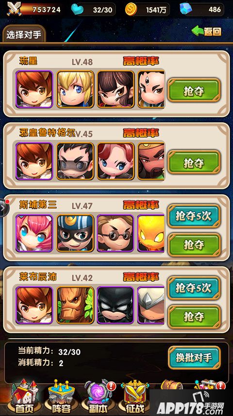 在选定争夺一种宝物碎片后,玩家可以选择不同队伍进行争夺,不同品质的宝物争夺成功率也有差别,当成功率太低时点击右下角“换批对手”可以刷新成功率。