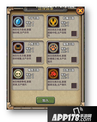 【分布】6个种族王国,军团长代表军团选择国家!【选国】军团前四不能选同一国家,战斗力最强国不能选!【初始】每个国家初始有1个主城,2个辅城,主城不能被攻打,也不能放置守军,其余为野城,可以攻打,如果攻城成功,会有防守军帮你守城哦!