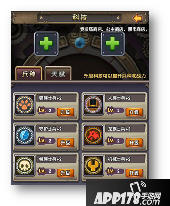 【兵种科技】升级后可以生产相对应的高级兵种【天赋科技】升级后国战战斗中会有相应的光环效果,可以各种叠加呢!