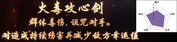与天怒惊雷一样,火毒攻心剑也是当前版本的强势技能,但是与重视爆发伤害的天怒惊雷不同,火毒攻心剑更为全面,持续中毒效果带来稳定的伤害,降低敌人幸运值同时可以让自身在战场上坚持更久。
