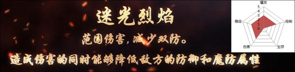 迷光烈焰这一技能各项数据较为均衡。减少双防的效果可以让己方打出更高的伤害。但是由于减少的双防为固定值而非根据百分比降低,因此这一技能与天怒惊雷、火毒攻心剑等技能相比还有一定不足。但是由于防御属性的收益递减,所以面对魔防或防御本身就不高的对手,迷光烈焰能打出更高的伤害。