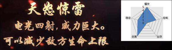 天怒惊雷在当前版本可以说是当之无愧的输出王者。超高的爆发伤害和不俗的控制能力,虽然降低血量上限的概率具有较大的不确定性,但是这不妨碍天怒惊雷成为当前版本爆发力最强的输出技能,同时也是综合能力最强的组合技能。所以无论是在PK还是打BOSS,天怒惊雷都能成为法师玩家的首选技能。