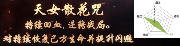 天女散花咒是六个组合技能中唯一一个回复技能,同时也是六个组合技能中最稳定的一个。群体持续回血并提升闪避的效果极大的增强了角色的生存能力,与之相比,“附赠”的少许伤害算是锦上添花。由于着重生存和稳定性强的特点,天女散花咒无论在PK还是BOSS战中都能返回出逆转局面的功效。