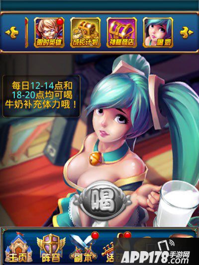 3.精彩活动里有“喝奶”,每天中午12点~14点,晚上18点~20点,均可喝牛奶补充50点体力,这是游戏里完全免费的福利