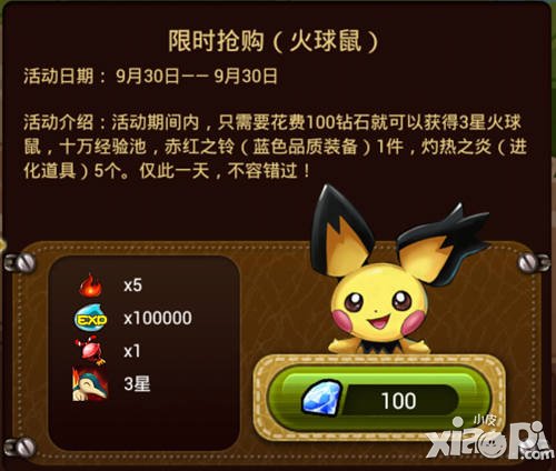 活动内容:活动期间只需要花费100钻石就可以获得3星的火球鼠,十万经验池,赤红之铃1个,炎热之炎5个。