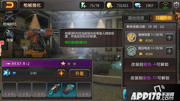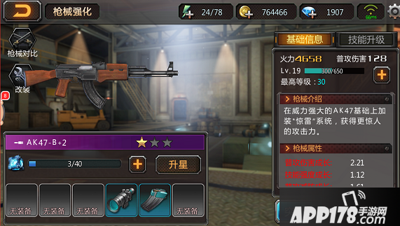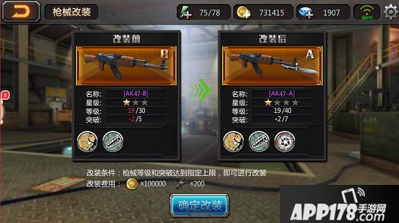 AK47初始就是紫色B级品质的枪械,继续进行养成最终可培养为SS级的枪械。达到规定的等级和突破次数后,就能用合金改装钳进行改装。改装后武器的各项属性会得到质的飞跃,同时也能解锁新技能。