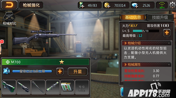 M700作为新手枪械拥有很多的局限性,枪械最高也只能升级到12级,而且无法升星。但是在游戏初期,M700的攻击力面对小杂兵绝对是碾压级别的,爆头的话几乎是一枪一个。