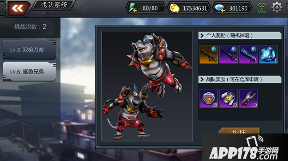 目前测试服中只有两个战队BOSS,分别是3级解锁的双枪刀客和6级解锁的鲨鱼兄弟。这两个BOSS的个人