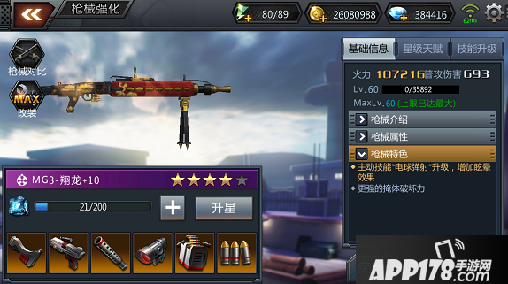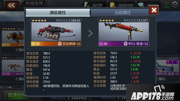 现在比较一下稀有级机关枪MG3翔龙和传奇级机关枪日炎燃烧的属性。从满级的火力来看,两者相差