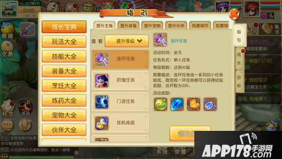 点击主界面指引按钮,在指引栏,可查看到提升人物等级可做的任务,点击提升装备、提升宠物、提升伙伴等都会有相应的玩法说明,玩家可自己查看完成不同的任务来提升自身的实力。