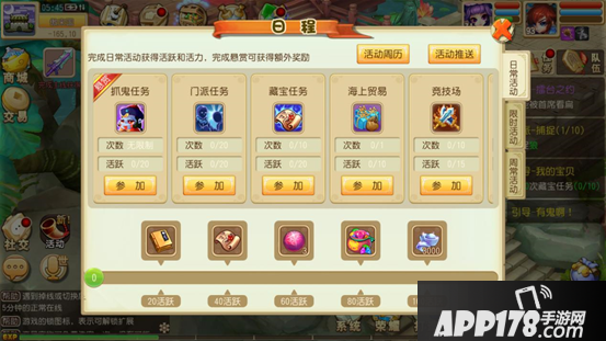 点击主界面日程按钮,可查看到每天可完成的任务,完成日常活动、限时活动、周常活动等都可以获得不同的材料和奖励,而且每个任务完成都会获得活跃度,活跃度达到条件,可领取下方的活跃度奖励。完成这些任务不仅可以提升人物等级,还可以获得任务给予的丰富物品、材料奖励来提升宠物和人物实力。