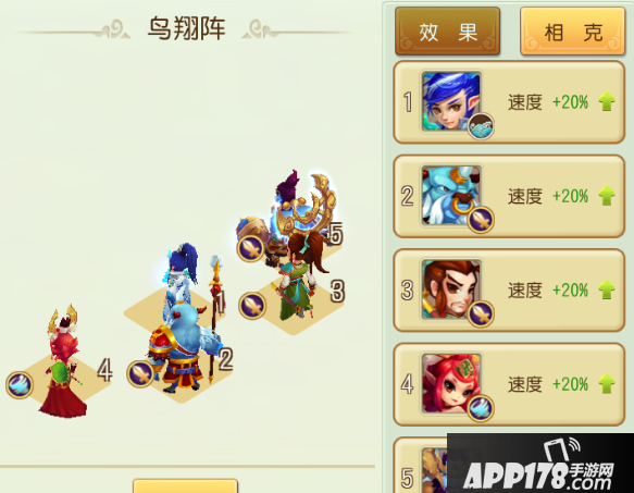 唯一的大幅度增加速度的阵型,适合重视出手顺位的高等级玩家PK。