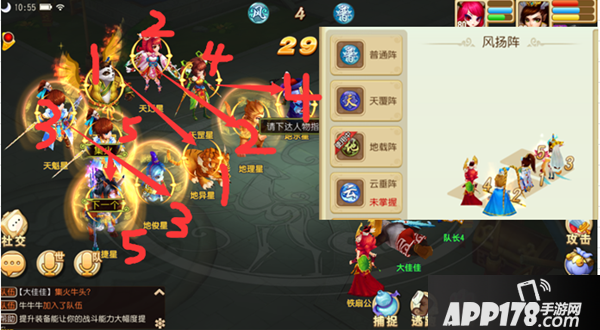 示例:在队伍里,打开风扬阵查看位置,怪物是旋转了180度,所以前排上方是4号位,下方是5号位。所以我们集火杀5号怪物时,可提醒队友下一个是杀5号的宠物。
