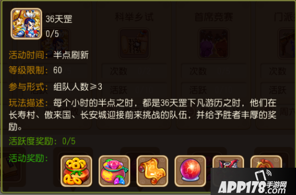 36天罡是游戏中一项很考验玩家间配合的玩法,难度高。与之对应的,是奖励也非常丰富,每次战斗胜利都可以获得道具奖励,如高级宠物技能书、珍兽之魂,是日常获得资源的一项重要玩法。