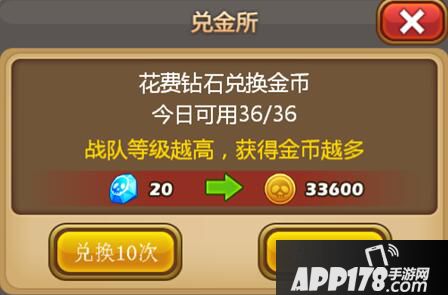 兑金所顾名思义,就是花费部分钻石获得大量金币的地方,战队等级越高,则获得的金币越多,VIP等级越高,则每日可以兑金的次数越多。