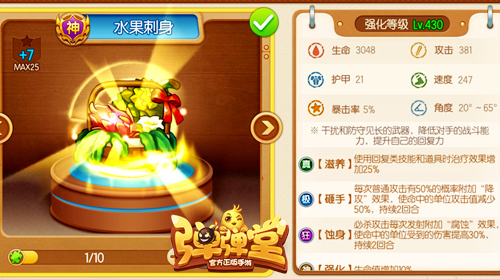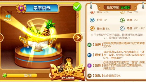 除了对BOSS战,“皇室果盘”在竞技模式中,打辅助也非常优秀。超强的自保能力,50%降攻对很多武器来说就是噩梦,再加上必杀的30%增伤,完全拥有以一磨二的能力,和水精灵宠物一起,几乎无人能克制!《弹弹堂手游》水果篮系武器,你今天调制了新品果缤纷吗?