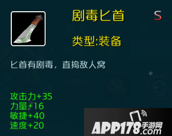 5.剧毒匕首:攻击力+35、力量+16、敏捷+40、速度+20