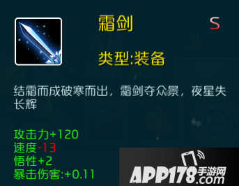 3.霜剑:攻击力+120、速度-13、悟性+2、暴击伤害+0.11