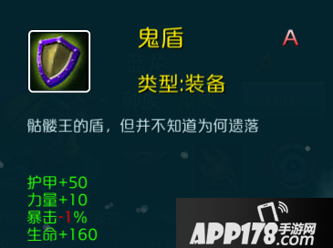 2.鬼盾:护甲+50、生命+160、力量+10、暴击减10%