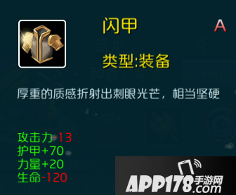 4.闪甲:攻击力-13、护甲+70、力量+20、生命-120
