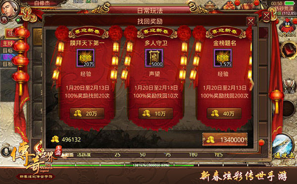 极具过年特色的舞狮、大头娃娃等特色怪物已经亮相财神庙副本,玩家们通过财神前往副本后击杀怪物,将可以狂暴满屏金币,最后赚钱的机会不可错过!春节期间未能登录游戏玩家也不用担心遗漏福利,各种奖励找回活动已经开启,快去领取专属奖励吧!明日,《传奇世界手游》还将开启领地争夺战,各大行会务必做好备战,迎接战斗的到来!