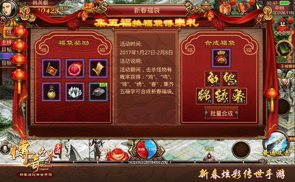 新年已过,但游戏之中依旧有超多热闹活动等待着大家。集五福活动持续进行中,活动期间击杀全民宝地、未知暗殿的怪物有概率获得“鸡”“鸣”“锦”“绣”“春”,集齐五福可合成新春福袋,开启福袋可获得限量豪礼。