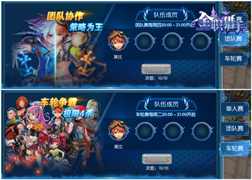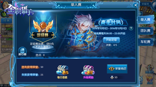 单人赛首先通过5场定级赛确定你的段位,之后便是段位晋升之路。从倔强青铜、秩序白银一路走向永恒钻石、最强王者的道路,战斗不息,荣耀不止。段位晋升可以说是简单的,因为前三阶只需获得3颗星,后三阶只需获得5颗星,胜利+1星,而当日首胜、连胜还有额外+1星。升段也可以说是艰难的,如何比相似战力的对手更能打,如何从更强战力的玩家手中险胜,每一次战斗都是全新的挑战。