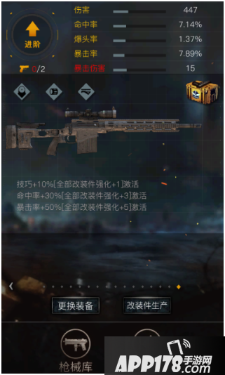 武器可直接提供伤害,命中,爆头率,暴击率,暴击伤害五种属性。通过枪械补给和boss战可以收集枪械,收集一定数量的枪械进行武器强化。可使用研发图纸直接生产武器可安装的改装件,改装件通过研发图纸+金币进行升级,武器所有部位改装件升级到一定程度时,可激活武器的套装属性。