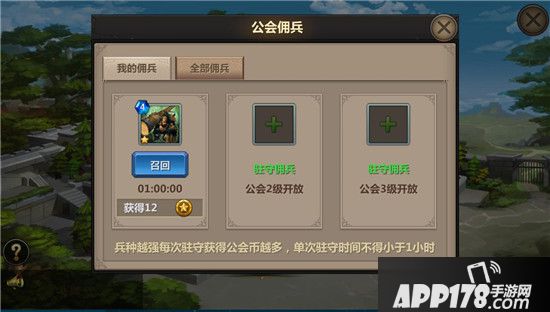 公会内,王者们可以驻守公会佣兵还能获得公会币,驻守佣兵最少一个小时;驻守的兵种越强,获得的公会币越多。也可以雇佣其他王者的兵种为自己战斗,当然,在雇佣的时候需要支付公会币。