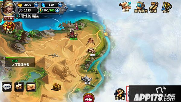 在玩家进入游戏后,经历海港城市“普兰尼”的战斗胜利之后,即可看到右下方的主体图标中会新增“兵营”,这里就是我们游戏中所有卡牌的一个入口,我们可以在这里对卡牌进行所有操作,例如:兑换、升星、装备、进阶。