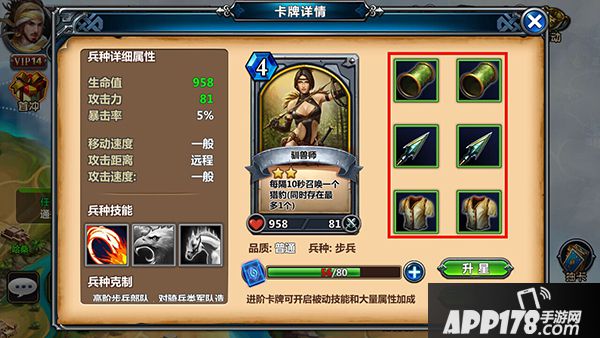 品质成长就是我们能看到兵种卡牌边上的卡牌框颜色,品质从低到高是普通(白色)、精英(绿色)、稀有(蓝色)、史诗(紫色)、传说(橙色)。我们卡牌的起始品质都是白色的,然后需要我们给我们的卡牌穿上各种装备去提升卡牌的品质;当然我们的辛苦是会有回报的,当兵种卡牌的品质提升之后,就可以解锁更多强悍的被动技能,我们可以根据各个兵种的被动技能特色和将军本身技能特色进行有效配合,打出许多让人意想不到的打法。