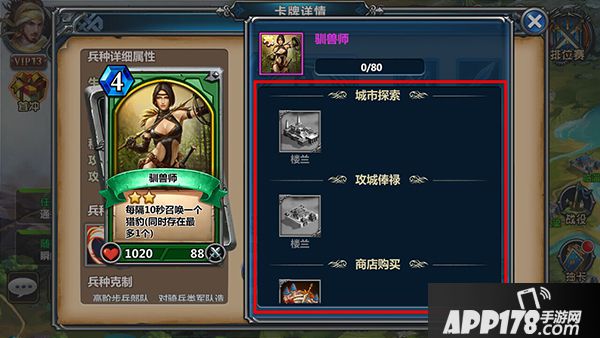 在我们没有获得某张卡牌的时候,我们也可以去点击卡牌进行来源查看;点击进去二级界面之后,我们可以看到在某些特定商店、城市关卡和战役关卡都会有几率掉落;当然还有我们的抽卡功能,运气好的时候还能一次十连抽出数张卡牌的喔。