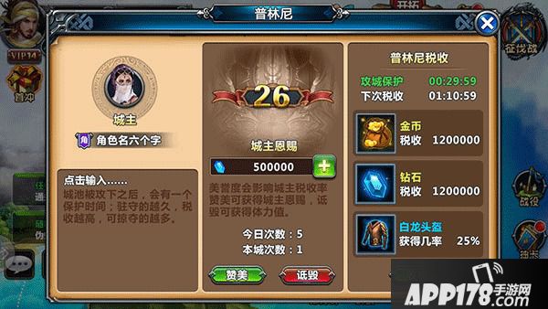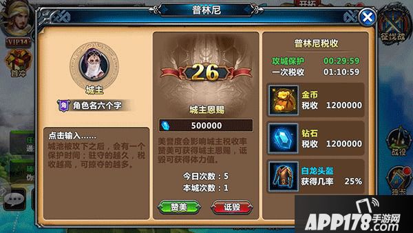 赞美:赞美城主,城主的荣誉值+1,赞美者可以获得随机的城主恩赐(钻石),当然没有钻石时,也可以获得随机的体力值。