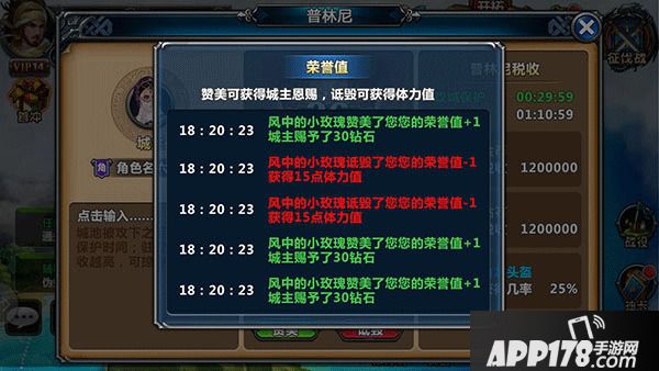荣誉值:荣誉值会影响到城主的产出,点击荣誉值可查看荣誉值日志,如下图: