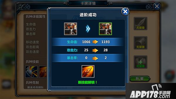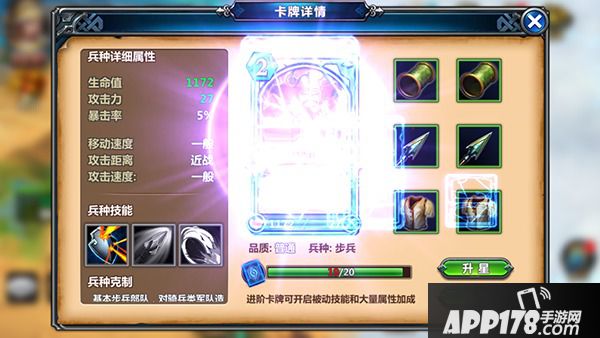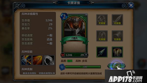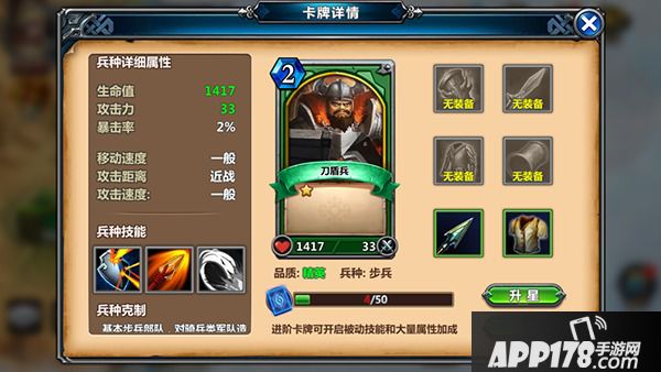 经过了几场战斗的奖励积累之后,我们就可以先加强一下兵种吧,凑齐了6件小装备我们就把小胖子刀盾兵提升一下,小胖子的卡牌立刻变成了绿色,看起来精神抖擞的;然后收集了足够的刀盾兵卡魂之后,可以对他进行升星,让他的能力提升一个台阶。