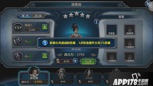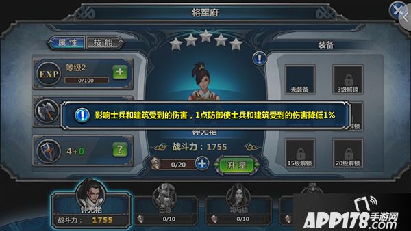 经过常规剧情之后,就来到了我们面临选择的时候了,系统会弹出一个界面让我们去选择我们的第一个将军,一个是萌萌哒的小萝莉---钟无艳,另外一个是满脸胡渣子的大叔---塞琉古;然后他们各有所长,我可以看到小萝莉的第一个技能是加群体攻击,而大叔的第一个技能是直接伤害;经过实践证明还是推荐大家选择钟无艳,因为到了后面塞琉古的技能伤害跟不上节奏,反而变成了鸡肋。选择完将军之后,那我们就来看看将军给我们带来什么了,我们来到了将军府,可以看到将军属性栏中有攻击力和防御力,而且将军的能力是和我们上场的兵种息息相关,将军的能力会直接加成到兵种的攻击和防御,这就说明了我们的将军能力越高,我们兵种的战斗力和生存能力越强,所以在前期我们可以先把将军培养起来吧。