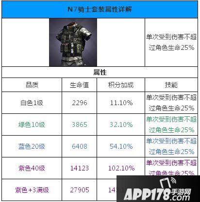 独立防线N7骑士套装穿戴效果一览,N7骑士套装的效果是单次受到伤害不超过角色生命25%。可以说这是个非常给力的装备,特别是在面对单体高爆发输出敌人时,可以有很好的效果。