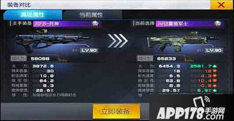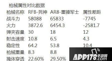 从熟悉对比来看,战斗力上RFB-死神相比AR8-重锤军士,AR8-重锤军士比RFB-死神高出了7745,火力上两把枪械相比AR8-重锤军士高于RFB-死神2581.7;弹夹容量则相比RFB-死神少了12发,射击速度RFB-死神高出了4.3,稳定性高出了10.4,枪械重量和掩体穿透两把枪械相差不多。