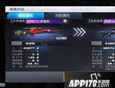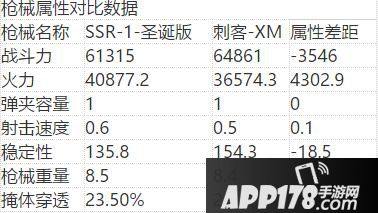 从属性上来看我们的SSR-1-圣诞版相比我们的刺客XM的战斗力上,刺客XM的战斗力比SSR-1-圣诞版高出了3546,火力上SSR-1-圣诞版相比刺客XM上的话,SSR-1-圣诞版高出了刺客XM4302.9,两把枪械都是狙击枪械所以弹夹容量两把枪械相同,枪械射速两把枪械相差不多。稳定性上我们的刺客-XM高出了18.5,枪械重量和掩体穿透两把枪械相差不多,从属性上来看两把枪械相差不多。