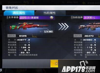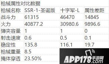 从属性上来看战斗力SSR-1-圣诞版相比十字军-L,我们的SSR-1-圣诞版高出了十字军-L14845,火力上SSR-1-圣诞版相比十字军-L,我们的SSR-1-圣诞版高出了十字军-L9896.6。弹夹容量由于两把枪械都是狙击枪所以弹夹容量相同。射击速度两把枪械相差不多;稳定性上SSR-1-圣诞版高出了十字军-L19.7,枪械重量和掩体穿透两把枪械也是相差不多。从属性上来看SSR-1-圣诞版更胜一筹。