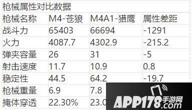 从属性上来看战斗力M4-苍狼相比M4A1-猎鹰,M4A1-猎鹰高出了M4-苍狼1291,火力M4A1-猎鹰高出215.2,弹夹容量相比多出了5发,射击速度M4A1-猎鹰和M4-苍狼相差不多,稳定性上M4A1-猎鹰高出了19.7,枪械重量和掩体穿透相差不多。
