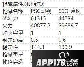 从属性上我们可以看到,战斗力PSG幻视相比SSG疾风,PSG幻视高出了SSG疾风16781; 火力上对比,PSG幻视相比SSG疾风,PSG幻视高出了11187.5,弹夹容量由于两把枪械都是狙击枪所以弹夹容量相同,射击速度SSG疾风高出0.4,稳定性、枪械重量、掩体穿透,两把枪械相差不多,单独从属性上来看PSG幻视略胜一筹。