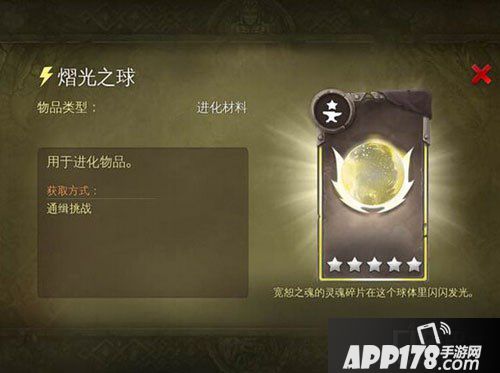 地牢猎手5进化材料熠光之球介绍!在地牢猎手中,我们升级专属通缉装备时候需要用到这个材料,任何一个光明属性的装备的和大部分其他属性的装备都需要这个家伙。下面APP178手游小编就来给大家说说这件熠光之球的图鉴介绍。