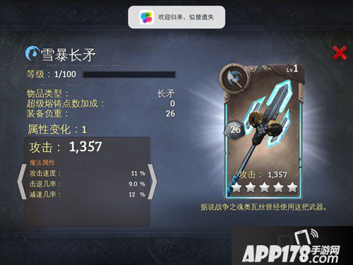 地牢猎手5寒冰属性5星图鉴介绍!地牢猎手5是一款非常好玩的手机游戏,在这款游戏中一共有五种装备,其中法杖和双弩是远程的武器,剩下的是近战。今天APP178手游小编给大家带来寒冰属性5星长矛的攻略,下面我们一起来看看吧!