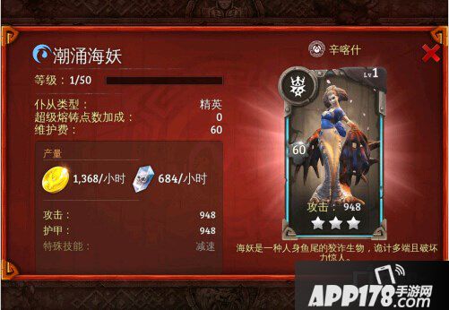 仆从介绍:海妖是一种人身鱼尾的狡诈生物,诡计多端且破坏力惊人。
