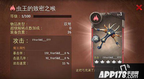 装备介绍:这把弓充满了虫王阿什塔炽烈的欲望,由他射出的箭削铁如泥。